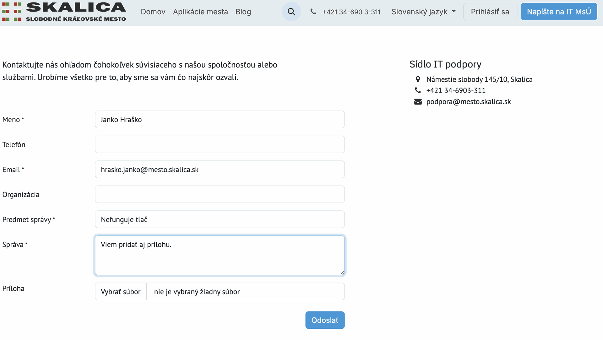 Vyplnenie formulára (požadované polia sú označené *), sa aktivuje rovnaký proces ako pri napísaní e-mailu na podpora@mesto.skalica.sk